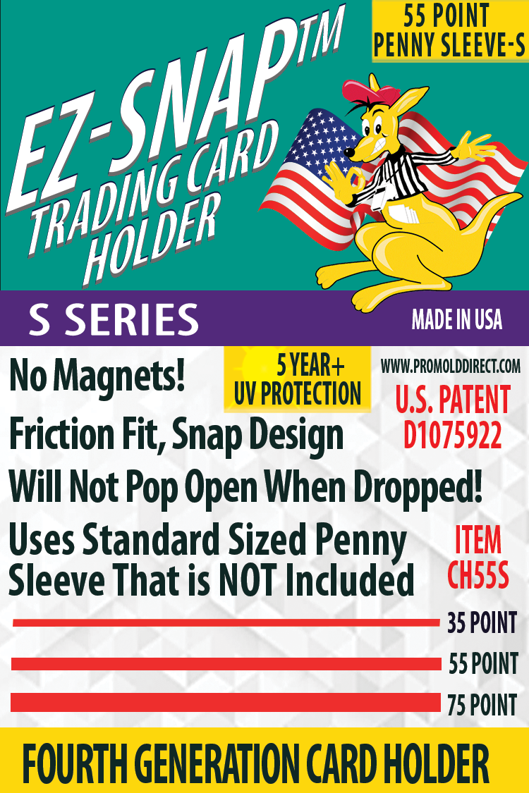 EZ-Snap™, 55 Point, 4th Generation Trading Card Holder that uses a standard penny sleeve. Friction fit, Snap Design. No more magnets, so less expensive and more environmentally friendly! Will NOT pop open when dropped!