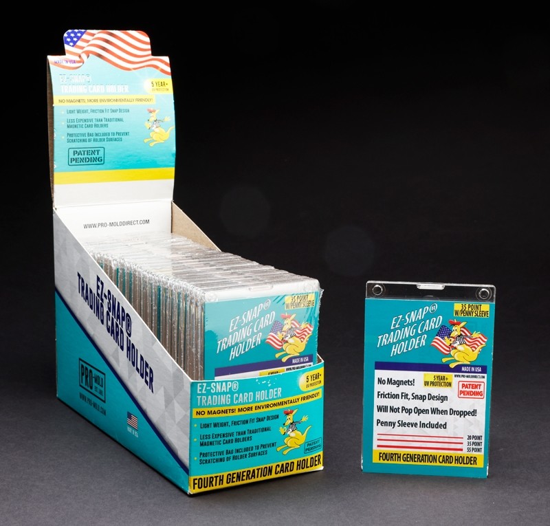 EZ-Snap™, 75 Point, 4th Generation Trading Card Holder that uses a standard penny sleeve. Friction fit, Snap Design. No more magnets, so less expensive and more environmentally friendly! Will NOT pop open when dropped!