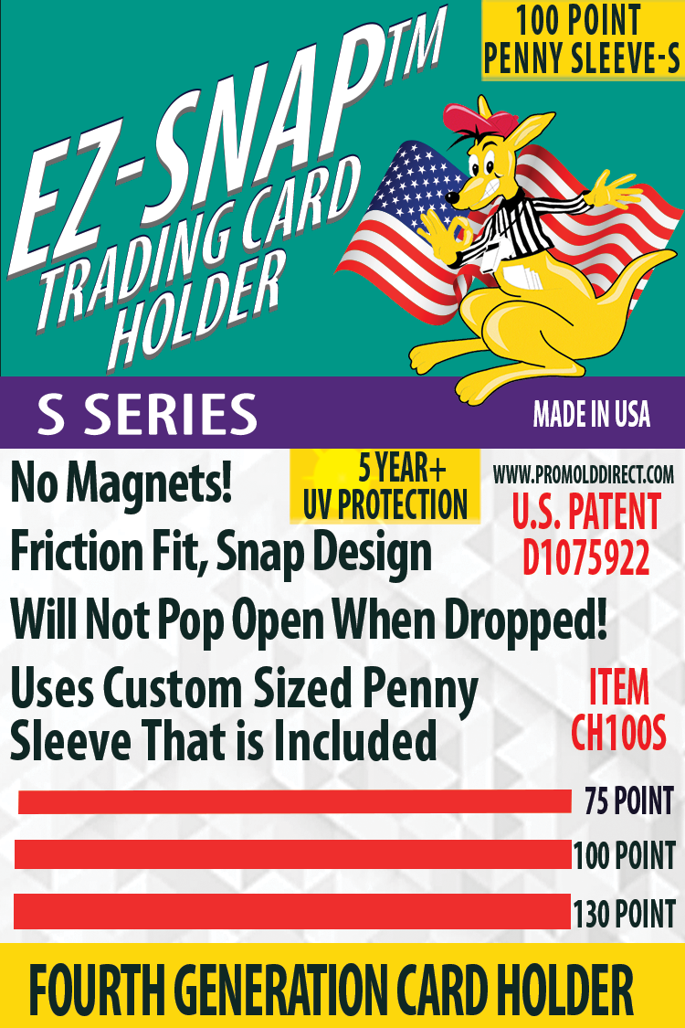 EZ-Snap™, 100 Point, 4th Generation Trading Card Holder. Friction fit, Snap Design. No more magnets, so less expensive and more environmentally friendly! Will NOT pop open when dropped!